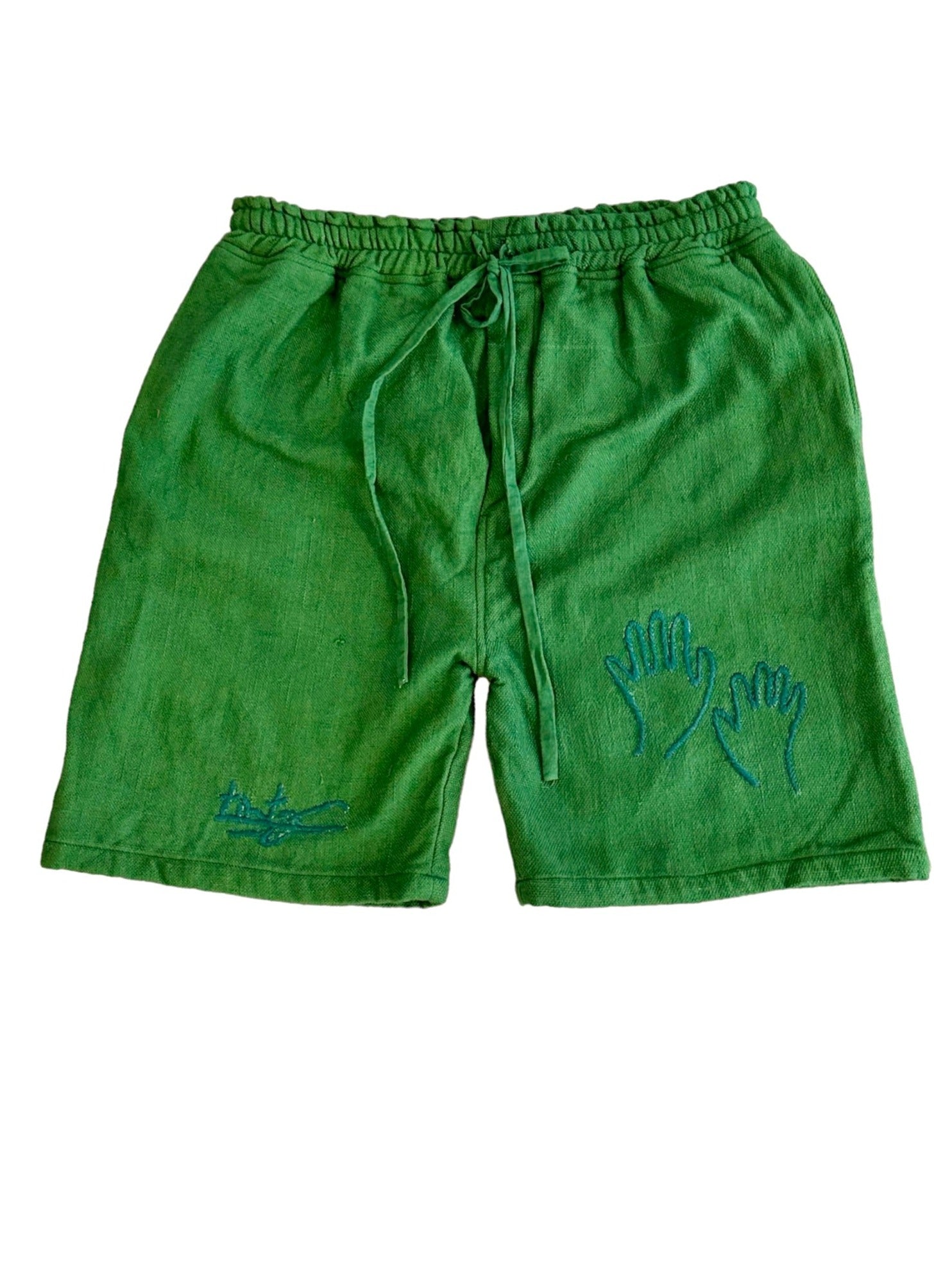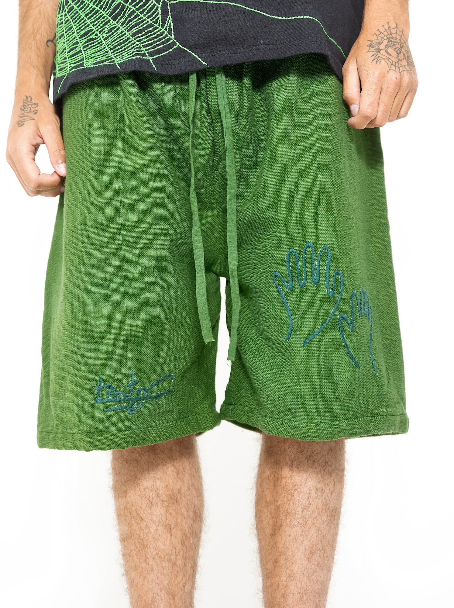 hand embroidered tints, hands, and back pocket written "100% organic cotton"