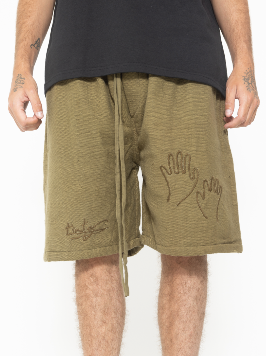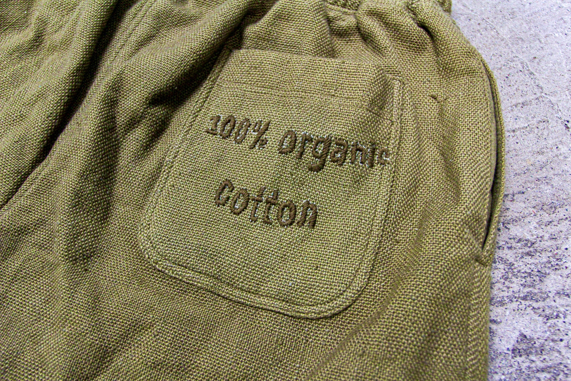 hand embroidered tints, hands, and back pocket written "100% organic cotton"